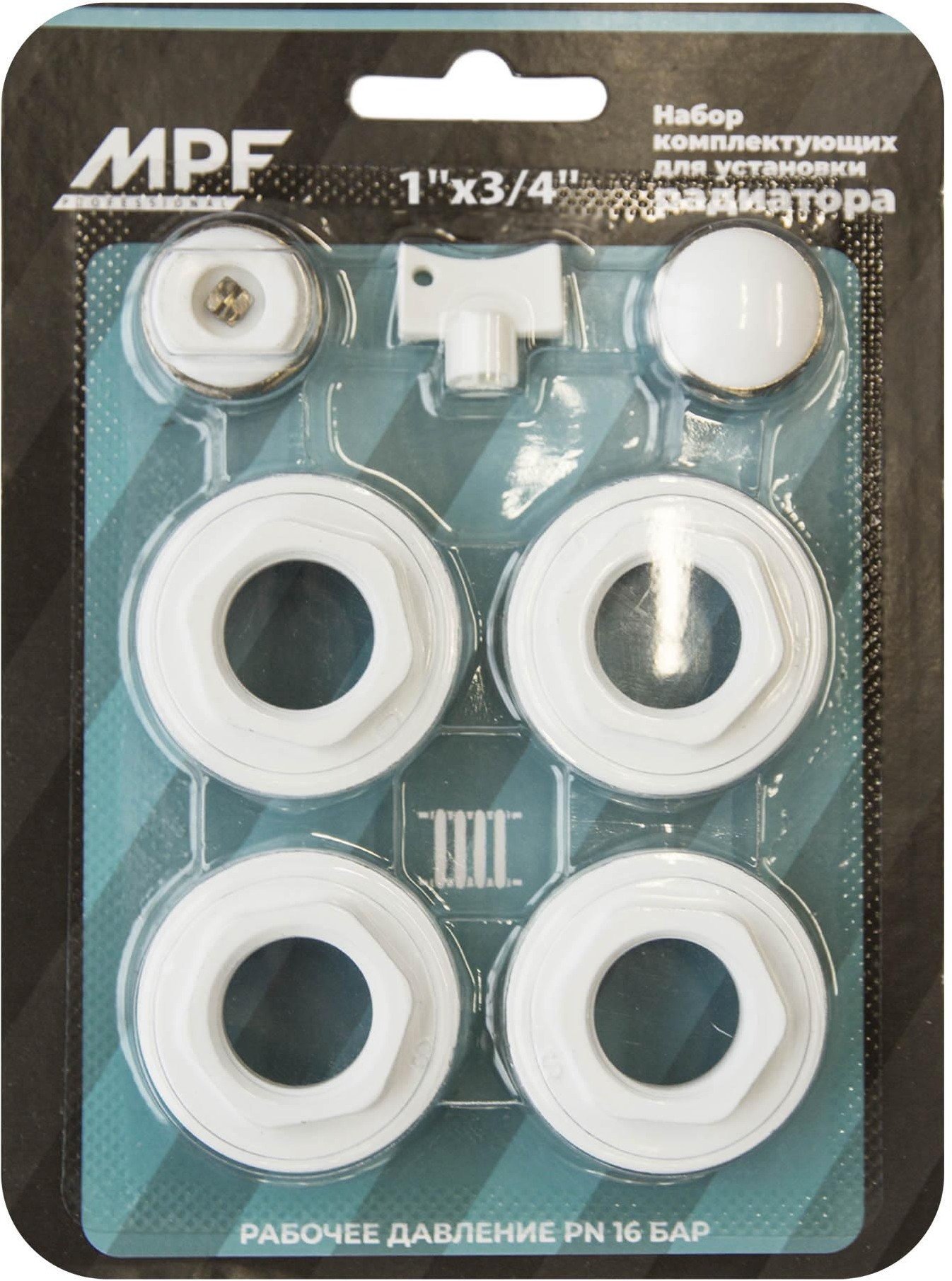 Комплект содержит четыре переходника с резьбы 1" на 3/4", заглушку 3/4", кран маевского 3/4" и ключ для крана маевского. Все резьбовые соединения снабжены прокладками.