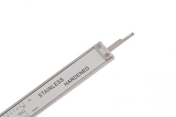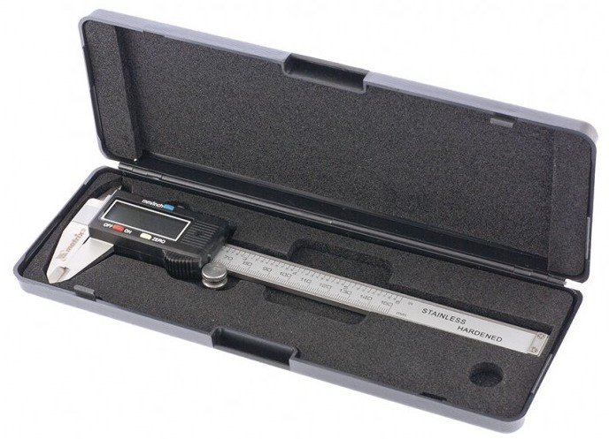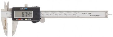 Штангенциркуль изготовлен из инструментальной нержавеющей стали. При перемещении бегунка по профилю инструмента показания измерений отражаются на жидкокристаллическом дисплее. Источник питания - одна батарея 1,5 В, тип SR44. Погрешность измерения 0,02 мм (< 100 мм) 0,03 мм (100–200 мм).