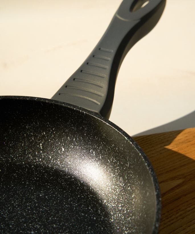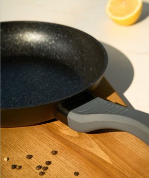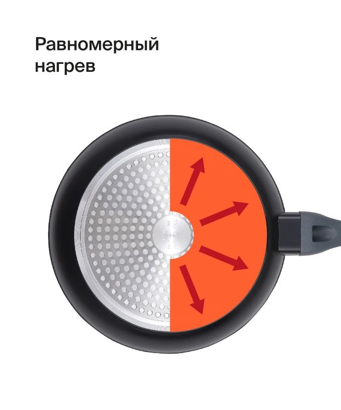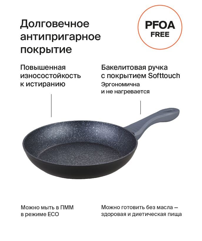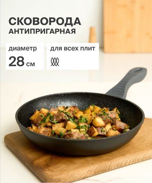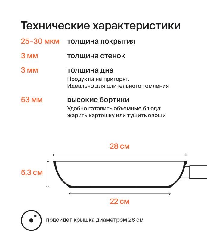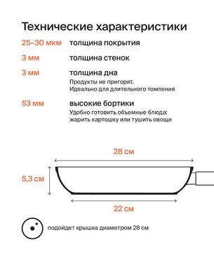 Бакелитовая ручка с мягким напылением. Трехслойное антипригарное усиленное покрытие, стандарт Pfluon. Толщина покрытия 29-32 мкм. Диаметр по верху (крышка): 28см, высота бортика 53 мм, толщина дна 3 мм. Покрытие не содержит вредных кислот (PFOA), а корпус изготовлен из пищевого сплава. Безопасно для здоровья. Прочное дно и корпус сковороды не подвержены деформации и обеспечивают равномерный нагрев. Диаметр дна и высота борта комфортны для готовки любых блюд.