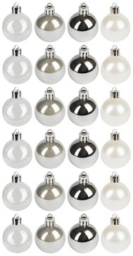 Чтобы декорировать елочку модно и элегантно, подвески на ней должны сочетаться между собой и с убранством комнаты. Важно не просто развесить свой "клад", но и хорошо продумать, где поместить ту или иную деталь. Один из самых простых способов решения этой задачи - выбрать елочные шарики одной цветовой гаммы. В этом вам поможет набор шаров 24 шт с серебряно-жемчужным оттенком , которые сделают украшение вашей новогодней елки еще более привлекательным.
