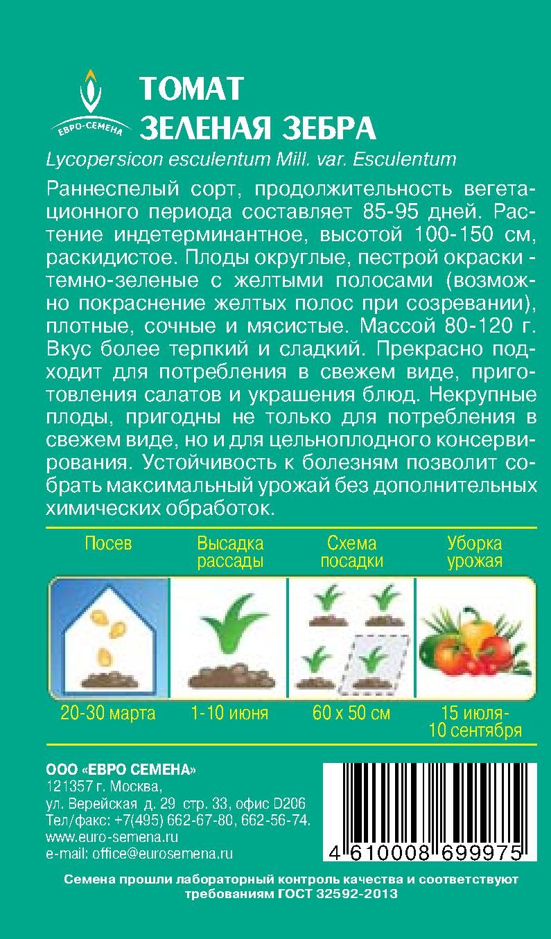 -30%Раннеспелый сорт, продолжительность вегетационного периода составляет 85-95 дней. Растение индетерминантное, высотой 100-150 см, раскидистое. Плоды округлые, пестрой окраски - темно-зеленые с желтыми полосами (возможно покраснение желтых полос при созревании), плотные, сочные и мясистые. Массой 80-120 г. Вкус более терпкий и сладкий. Прекрасно подходит для потребления в свежем виде, приготовления салатов и украшения блюд. Некрупные плоды, пригодны не только для потребления в свежем виде, но и для цельноплодного консервирования. Устойчивость к болезням позволит собрать максимальный урожай без дополнительных химических обработок.