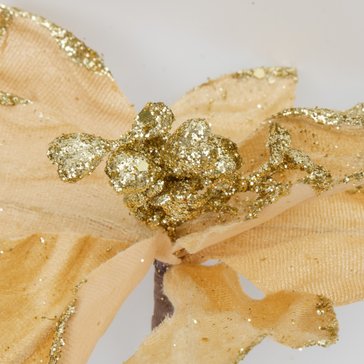 Добавьте в праздничный интерьер ноту утончённой роскоши с декоративным цветком в благородном золотом исполнении. Компактные размеры позволяют вписать его в любое пространство, а сияющий оттенок мгновенно привносит ощущение праздника и элегантности.