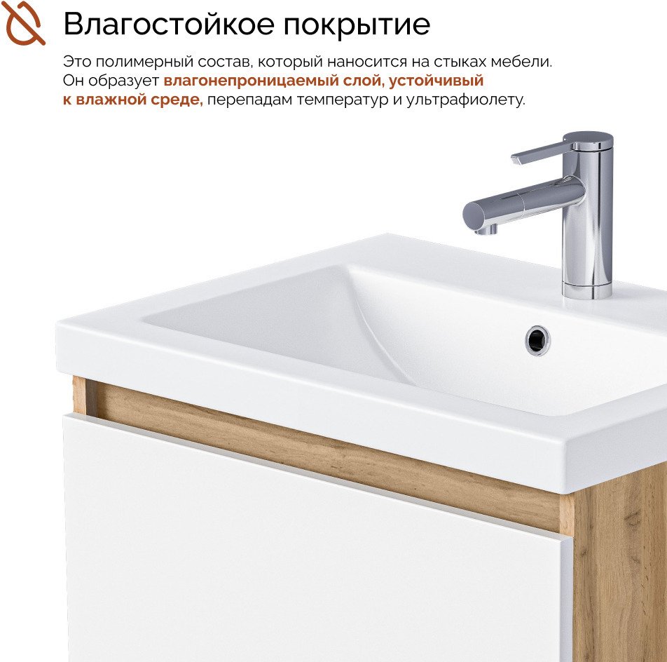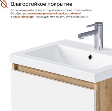 ∙ Материал фасада – МДФ с матовой пленкой ПВХ, ящик и корпус – ЛДСП с технологией PROTECT, благодаря этому тумба сохранит первозданный вид в условиях повышенной влажности.