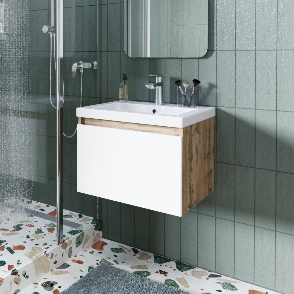 Тумба подвесная TWIN mini 60см дуб вотан/белый глянец в комплекте с раковиной