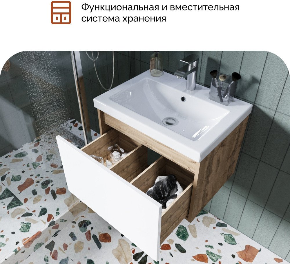 ∙ Выдвижной ящик позволяет эффективно организовать хранение различных предметов – средств личной гигиены, косметики, полотенец, бытовой химии.