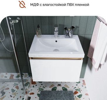 ∙ Материал фасада – МДФ с матовой пленкой ПВХ, ящик и корпус – ЛДСП с технологией PROTECT, благодаря этому тумба сохранит первозданный вид в условиях повышенной влажности.