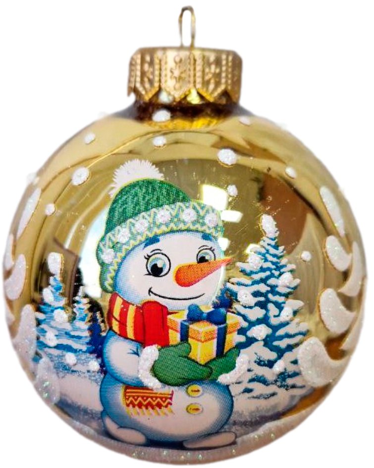 - Шар с узором Снеговик с подарком 8см, золото, подарочная упаковка, КУ-80-244003