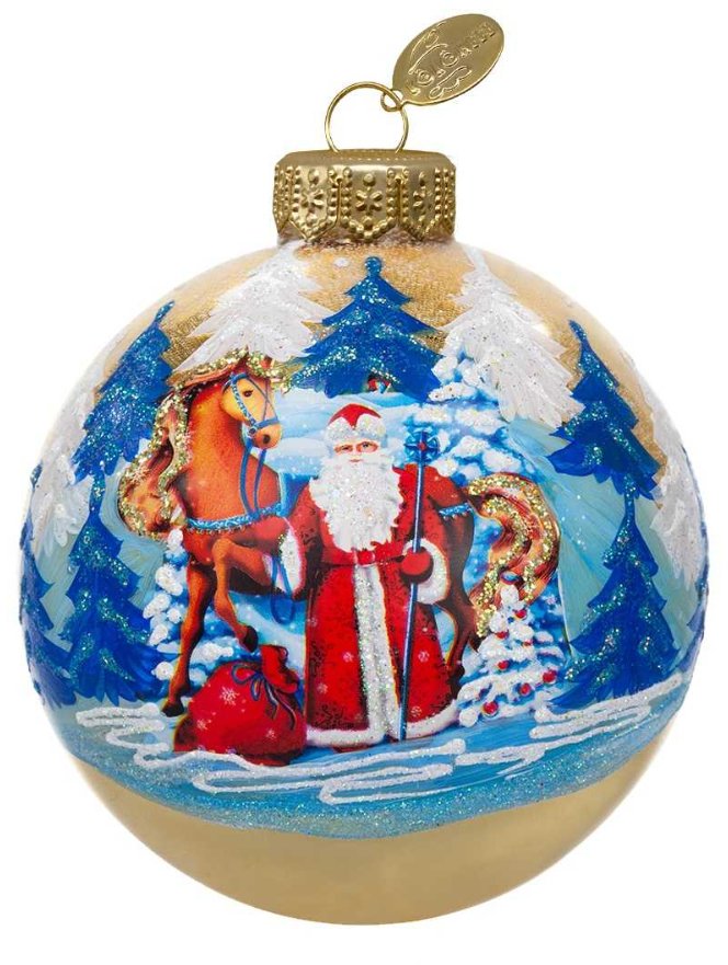 Погрузитесь в атмосферу настоящего волшебства с роскошным новогодним шаром, украшенным изящным узором Деда Мороза и его верного друга-лошадки! Этот великолепный предмет декора станет главным украшением вашей праздничной ёлки.
