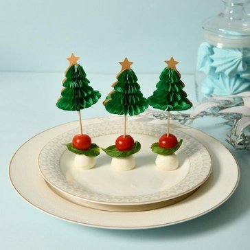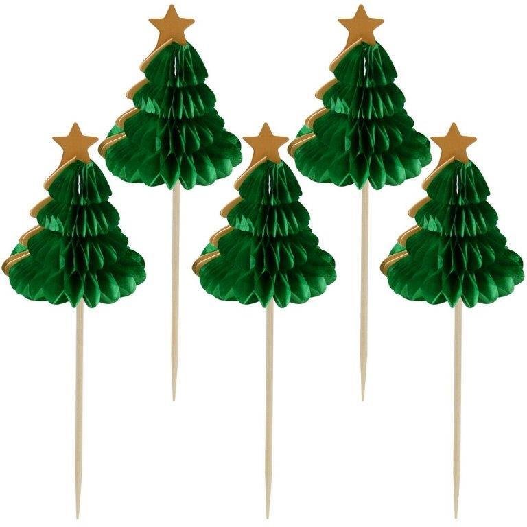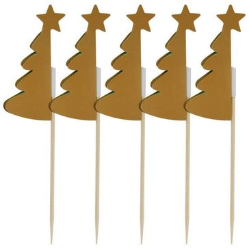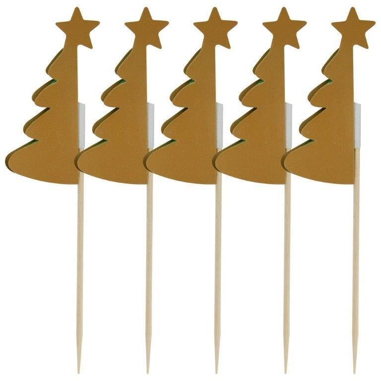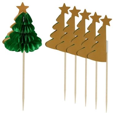 Придайте индивидуальности своему празднику и удивите ваших родных и близких. Топпером в форме елочки можно украсить торт, кекс, маффин или другую выпечку. Такой топпер добавит оригинальности и красоты в любой десерт и станет настоящим украшением праздника. Топпер можно использовать как шпажку при сервировке стола многослойными мини-бутербродами (канапе) из овощей, фруктов, ягод, сыров и мясных продуктов. Выбирайте любимые ингредиенты для приготовления порционных блюд, насаживайте их на топпер и готовьте с удовольствием! Топперы заменят десертные вилочки на вашем праздничном столе, а оригинальный дизайн поднимет настроение гостям. Предназначены для одноразового использования. Изготовлены из дерева (бамбук), декор из бумаги. Общая длина 13,5 см.