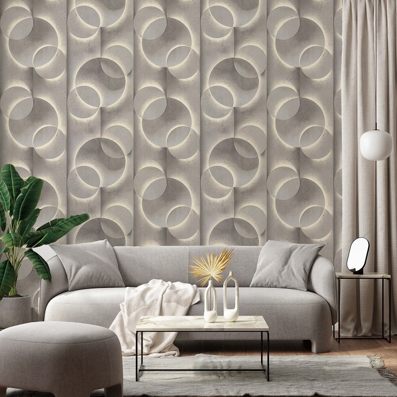 Благодаря уникальной структуре и продуманным колористическим сочетаниям удалось добиться эффекта подсветки и 3D-объёма. Обои не требуют подбора рисунка, что делает процесс поклейки простым и удобным, а также позволяет сократить расход материала и время на монтаж. «Орбита» — выбор для тех, кто не приемлет скучный интерьер.