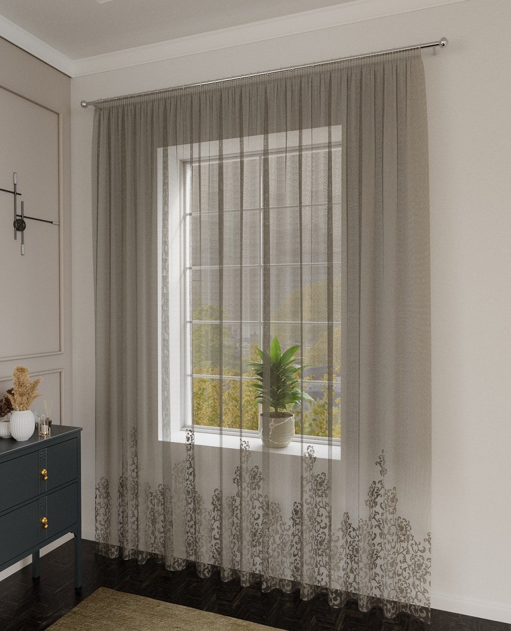 Тюль «Guipure Classic» из серого гипюра с цветочным узором (высота 290 см) — изысканное решение для оформления окон. Ажурная текстура и рельефный орнамент придают изделию утончённый вид, создавая в интерьере атмосферу лёгкости и воздушности. Серый оттенок отличается универсальностью: он гармонично вписывается в разные стили — от классического до современного, визуально не перегружает пространство и мягко сочетается с широкой палитрой цветов. Полупрозрачная структура ткани деликатно рассеивает свет, сохраняя приватность и добавляя окну выразительный декоративный акцент. Подходит для гостиной, спальни или столовой — везде, где хочется подчеркнуть элегантность интерьера с помощью изящного текстильного элемента.