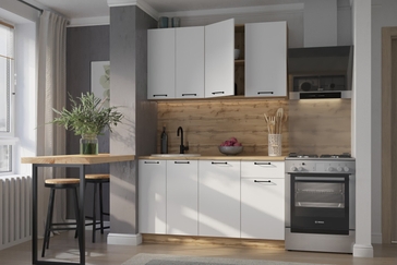 Кухонная линейка «Хелмер» — универсальное решение для интерьеров любой площади. Лаконичный дизайн с белыми фасадами и чёрными металлическими ручками придаёт кухне современный, чистый облик и помогает гармонично организовать пространство.