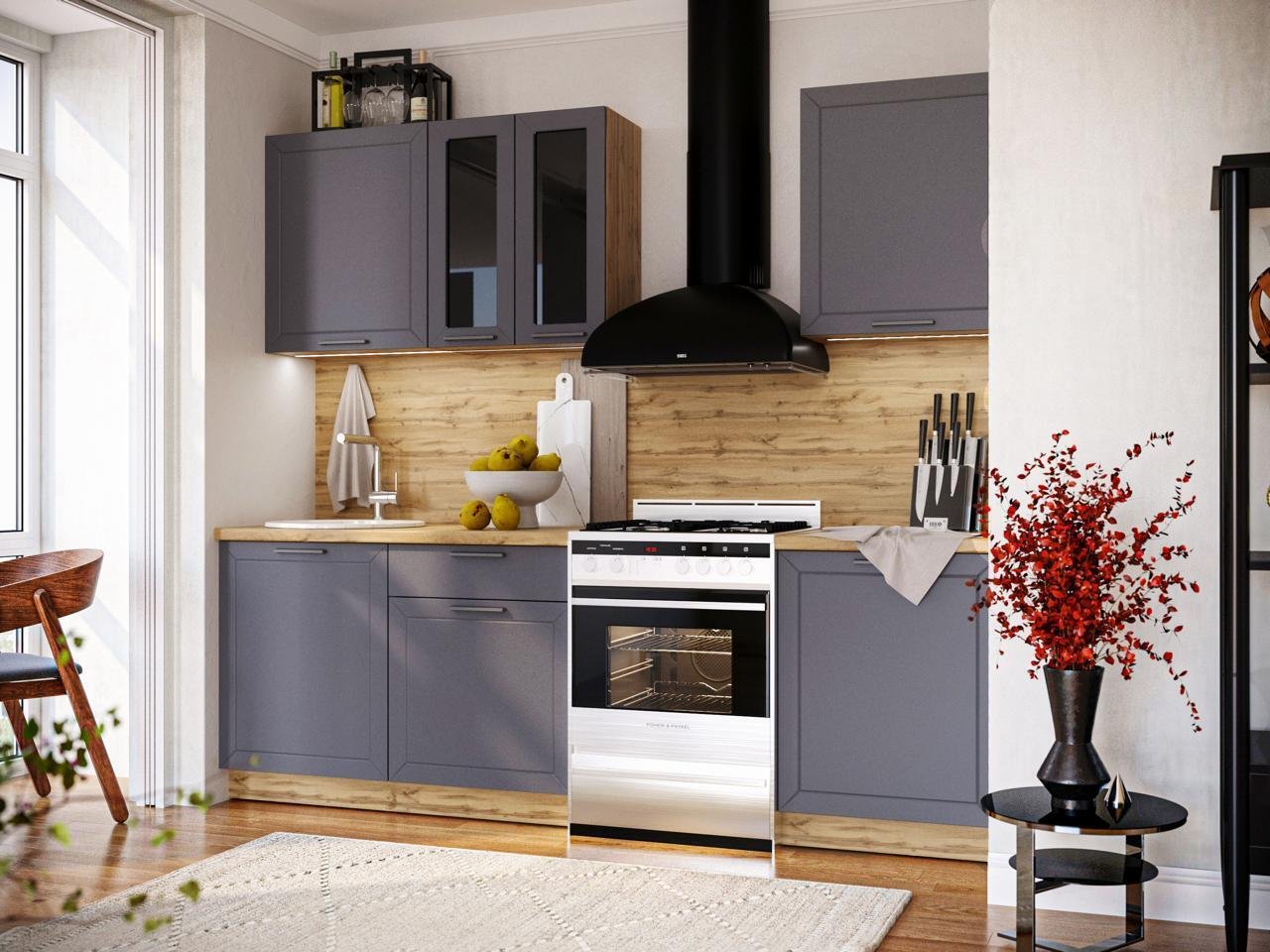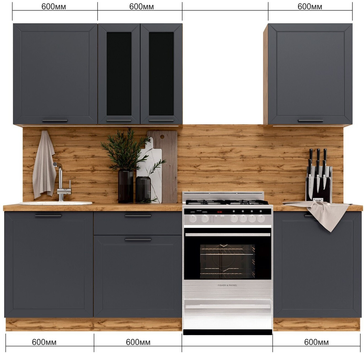 Этот элегантный кухонный гарнитур сочетает в себе строгий дизайн и максимальную практичность. Благородное сочетание оттенков «Вотан» и «Маренго» с шелковистой текстурой создает солидный и современный образ вашей кухни, а продуманная комплектация обеспечивает удобное хранение и комфортную рабочую зону. Идеальное решение для тех, кто ценит стиль, функциональность и готовые решения.