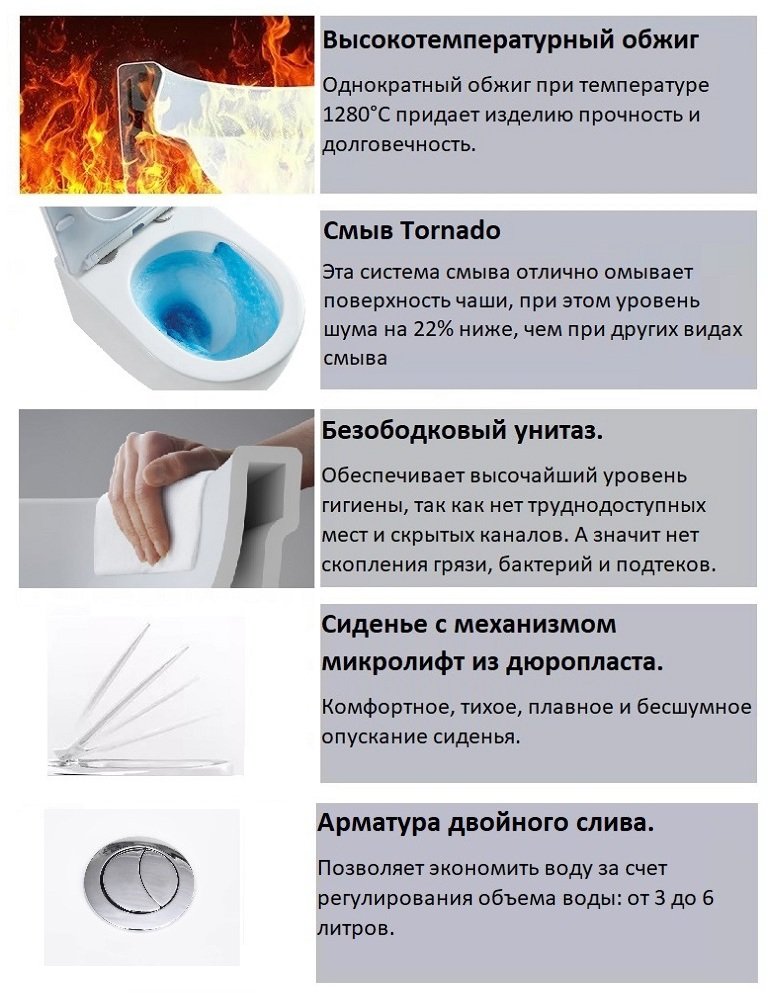 Смыв в унитазе происходит по принципу TORNADO – поступающая из отверстия в чаше вода мощным потоком закручивается (эффект водоворота) и полностью очищает всю внутреннюю поверхность чаши. При этом воды требуется на качественный смыв в небольшом количестве.