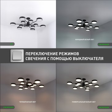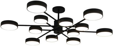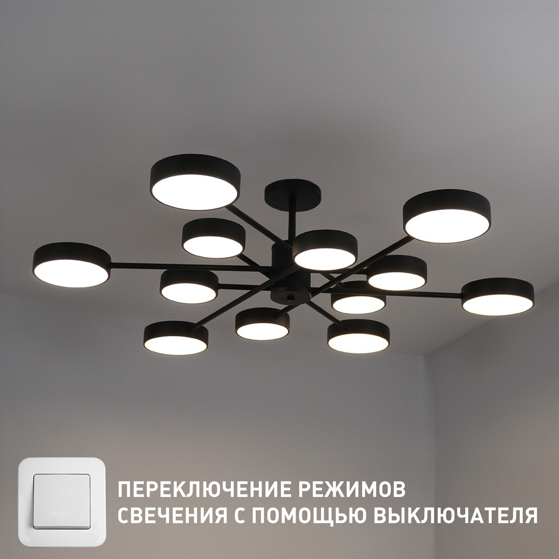 Люстра MATEO 150W 12R‑ON/OFF‑1014×250‑BLACK/WHITE‑220‑IP20 — современное управляемое светодиодное решение для просторных помещений. Её внушительные габариты (диаметр 1014 мм, высота 250 мм) и мощность 150 Вт обеспечивают яркое, равномерное освещение площадью до 25–30 м². Дизайн выдержан в лаконичной чёрно‑белой гамме: металлическое основание сочетается с матовыми полистироловыми рассеивателями, что придаёт изделию строгий, но стильный вид, подходящий для современных интерьеров.