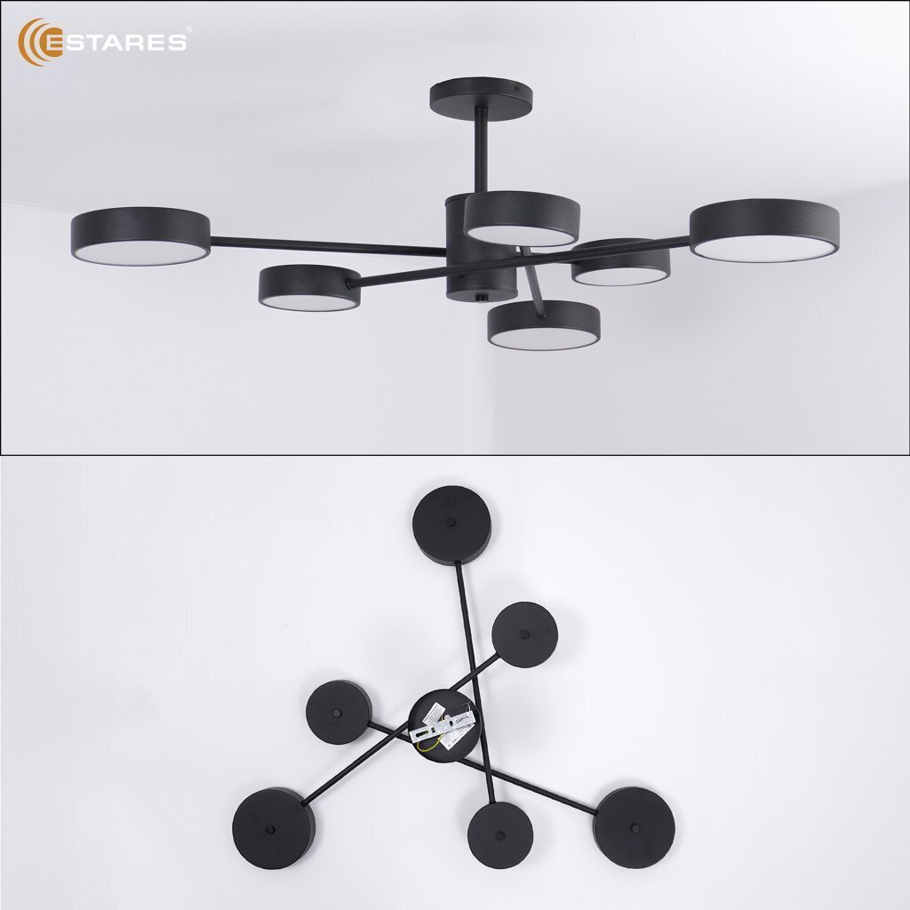 Люстра MATEO — современное управляемое светодиодное решение для просторных помещений. Её габариты (диаметр 915 мм, высота 250 мм) и суммарная мощность 75 Вт обеспечивают яркое и равномерное освещение, подходящее для гостиных, холлов или офисов. Дизайн выдержан в лаконичном стиле: металлическое основание в чёрно‑белой гамме сочетается с матовыми акриловыми (полистироловыми) рассеивателями, что придаёт изделию сдержанную элегантность и универсальность.