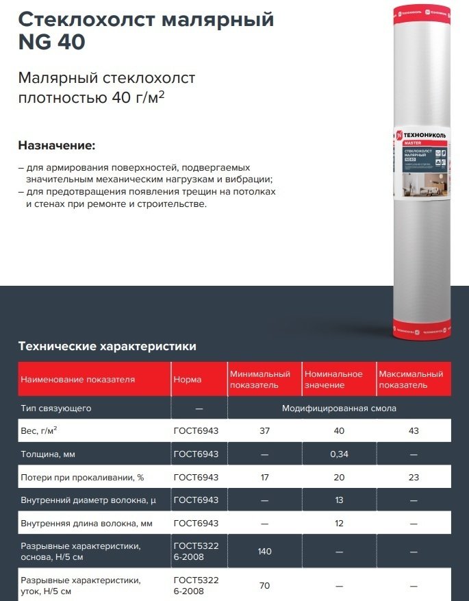 - Стеклохолст малярный ТехноНИКОЛЬ NG40 1x50м (50г/кв.м)