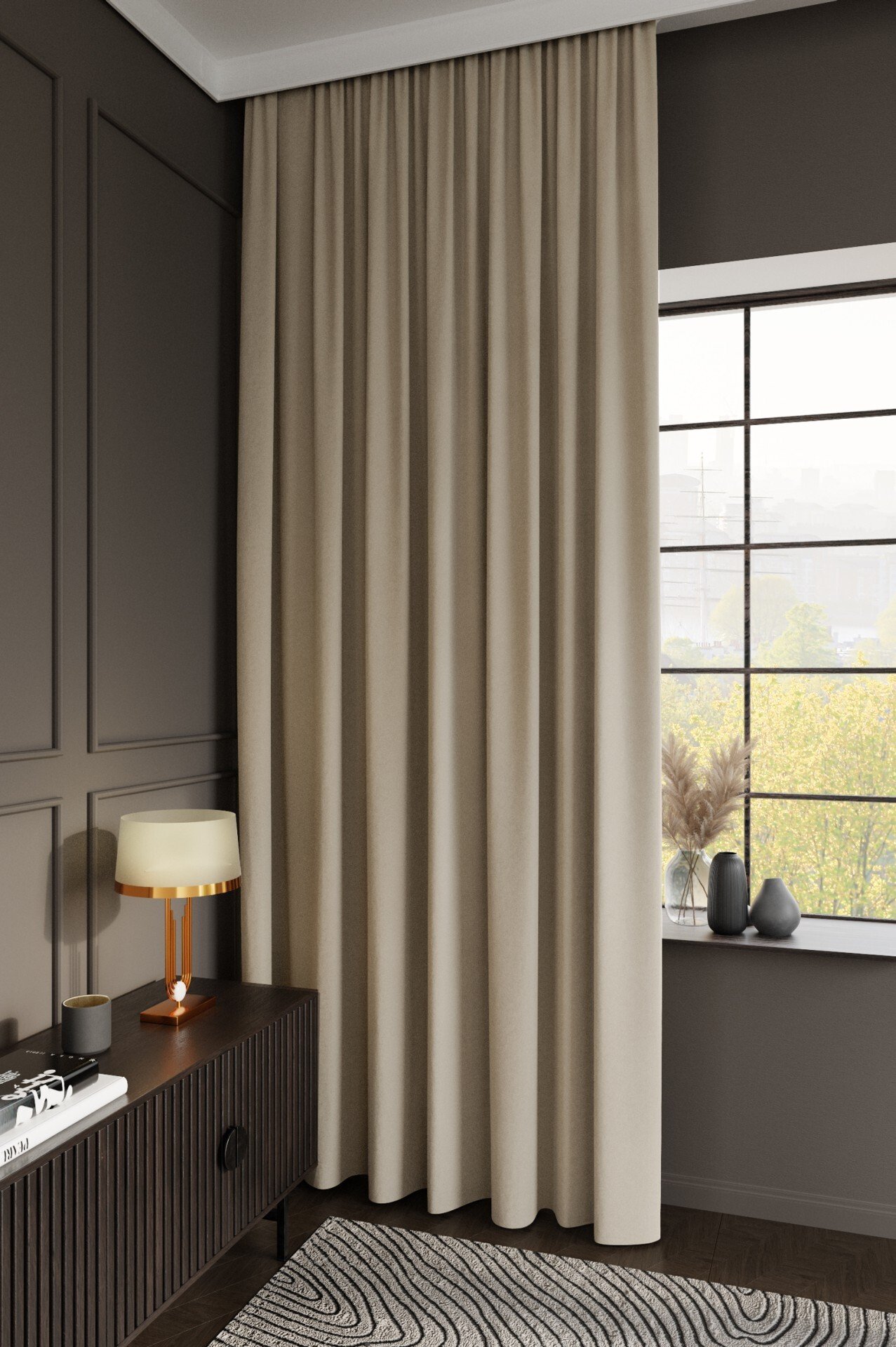 Серо-бежевая бархатная портьера — изысканный акцент в интерьере. Плавно ниспадающая, она создаёт атмосферу уюта и благородной сдержанности. Мягкое сияние ткани добавляет пространству тепла, а благородный оттенок гармонично сочетается с разными стилями оформления.
