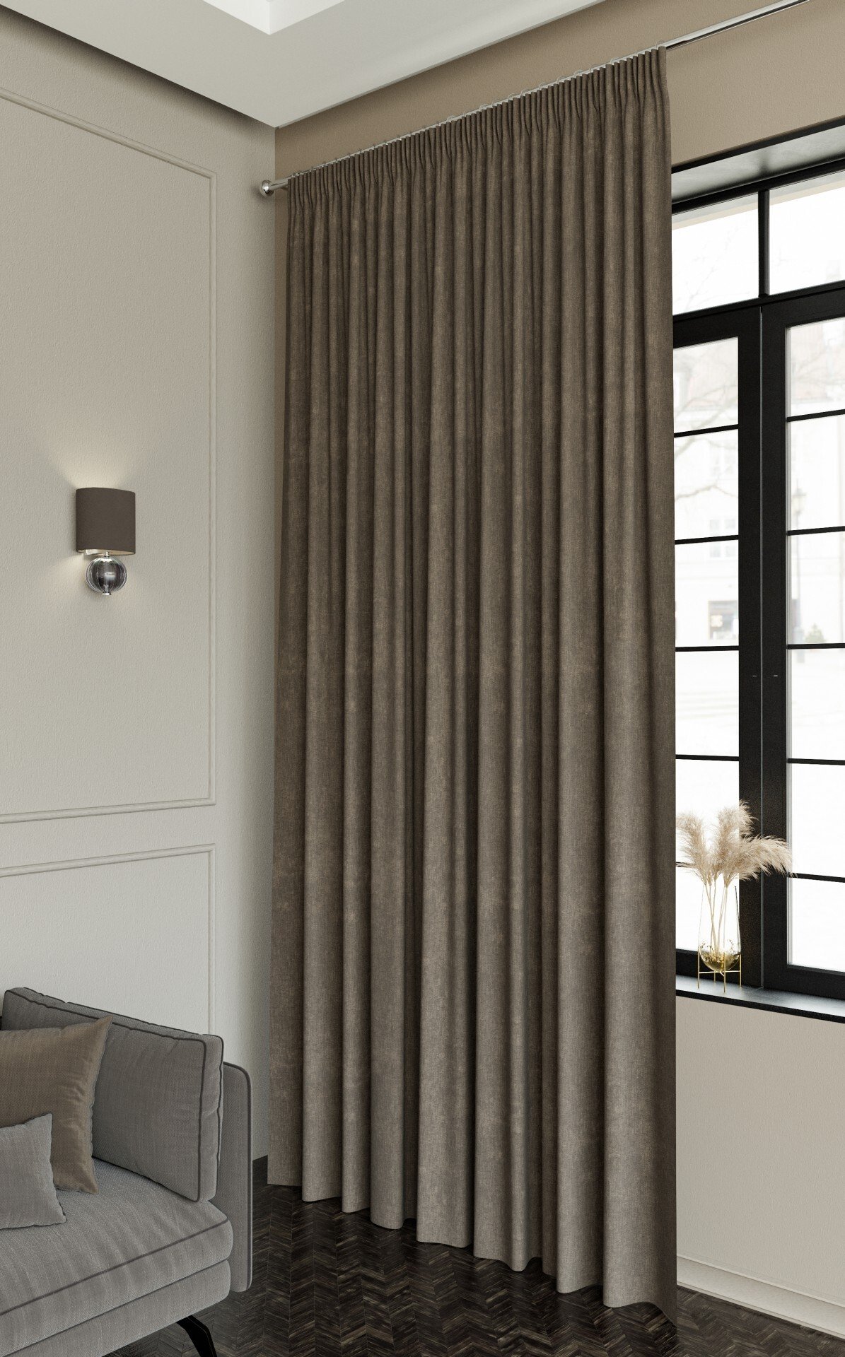 Благодаря особой структуре материала (переплетению пушистых и гладких нитей) портьера выглядит объёмно и тактильно привлекательно. Плавные складки формируют элегантный силуэт у окна, создавая атмосферу умиротворения и домашнего комфорта.