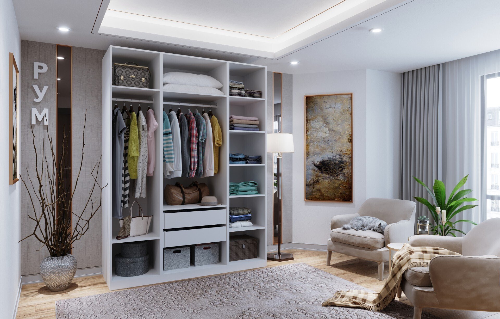 - Используйте в гостиных или спальнях с высокими потолками для создания элегантных мебельных стенок.