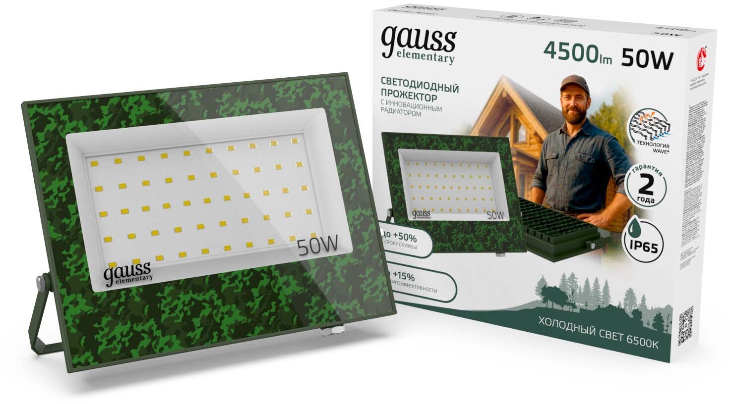 - Прожектор светодиодный Gauss Elementary 50W 4500lm IP65 6500К ХАКИ 1/40