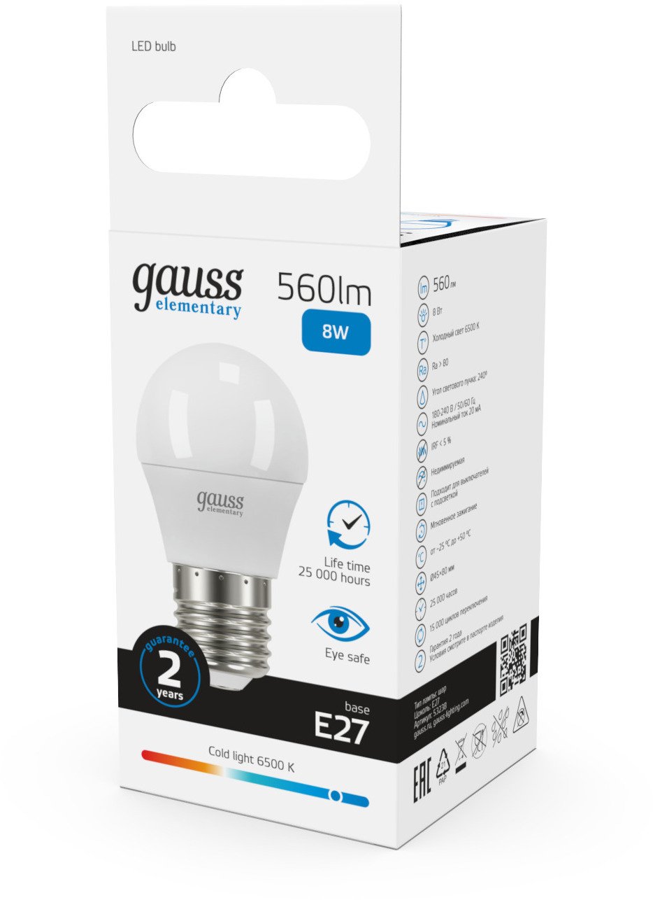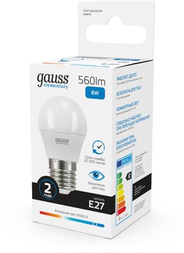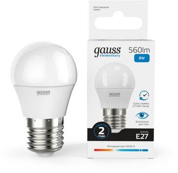 - Лампа Gauss Elementary Шар 8W 540мл 4100K Е14 LED 1/10/100