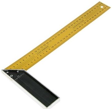 Состоит из двух плеч: основания (колодки) и линейки, скрепленных под углом 90°. Двухсторонняя разметка в см.